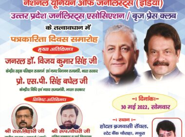 मथुरा।30 मई को होगा पत्रकारिता दिवस समारोह – केन्द्रीय मंत्री जनरल वी.के. सिंह एवं एस.पी. बघेल होंगे शामिल