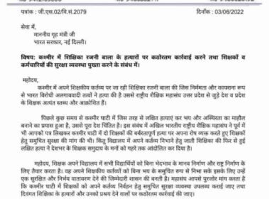 मांग, प्रदेशभर में मुख्यालय पर देंगे ज्ञापन देवेन्द्र गोस्वामी पीडीयू समाचार मथुरा। कश्मीर में शिक्षिका रजनी बाला के हत्यारों पर कठोरतम कार्रवाई करने तथा शिक्षकों व कर्मचारियों की सुरक्षा व्यवस्था पुख्ता करने के लिए राष्ट्रीय शैक्षिक महासंघ उत्तर प्रदेश द्वारा गृह मंत्री, भारत सरकार और उप राज्यपाल जम्मू एवं कश्मीर […]