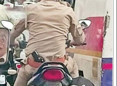 खुली पिस्टल- बिना हैलमेट बाइक पर स्टाइल मारते सिपाही का हुआ चालान