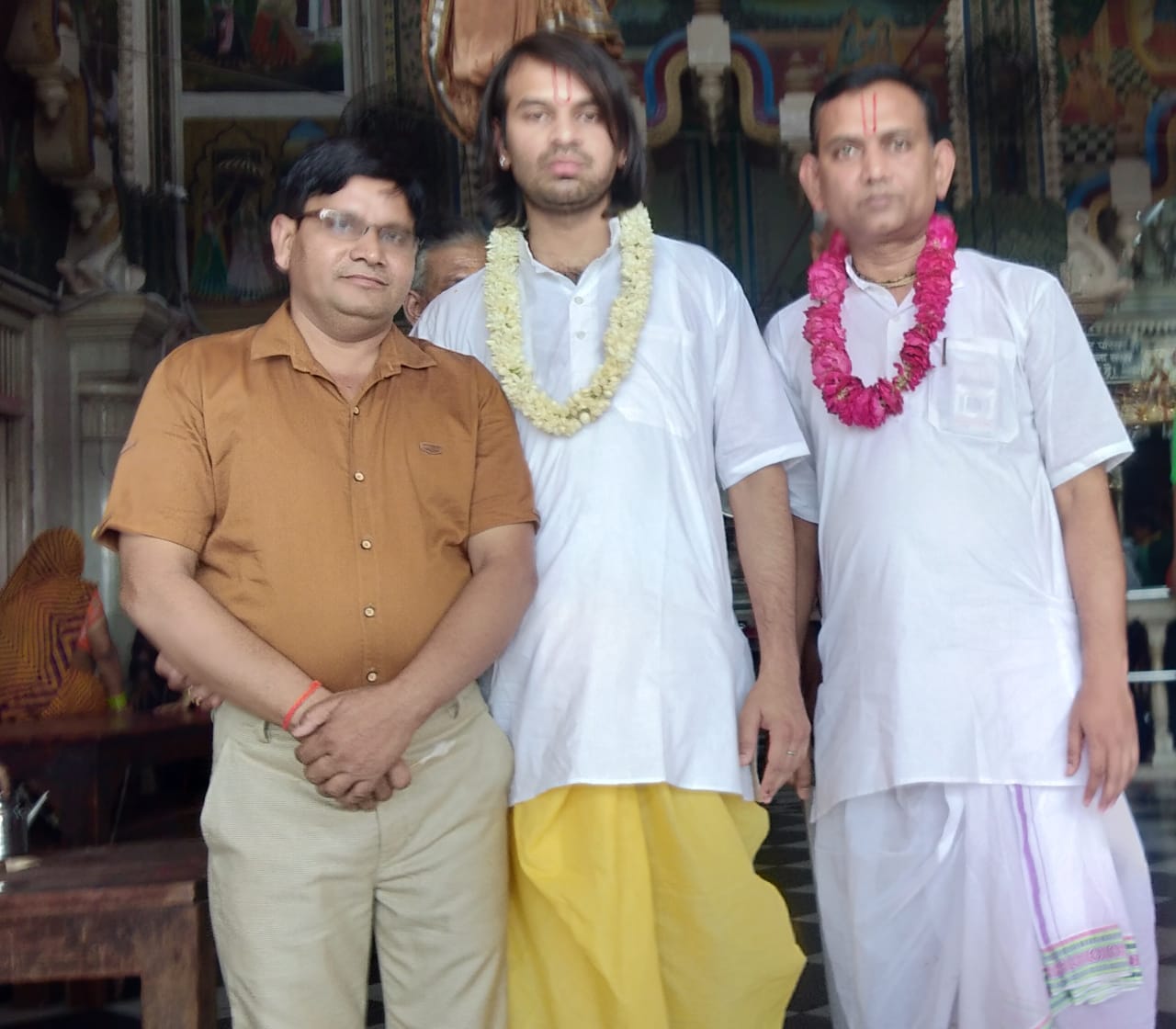 -बिहार के पूर्व स्वास्थ्य मंत्री तेजप्रताप के साथ उनके सखा बरसाना निवासी लक्ष्मण प्रसाद शर्मा