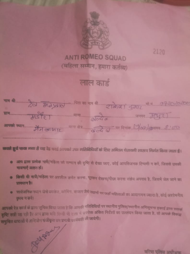 बलदेव- पुलिस ने अपना टारगेट पूरा करने के लिए व्यापारियों के हाथ में महिला सम्मान हमारा कर्तव्य के अंतर्गत एंटी रोमियो एस्कॉर्ट कार्ड थमा दिया। घटना शुक्रवार की शाम 8:00 बजे की है । व्यापारी देवेंद्र अग्रवाल बलदेव में काका माकेंट में मोबाइल रिपेयिग की दुकान करता है। प्रतिदिन की तरह वह अपनी दुकान बंद कर श्री दाऊजी महाराज के दर्शन करने के लिए मंदिर आया हुआ था। मेन बाजार में ही पुलिस द्वारा गश्त के दौरान उसे रोक लिया गया। और उससे हेलमेट के बारे में पूछा। उस पर हेलमेट ना होने के कारण उससे उसका नाम पता एवं पूरी जानकारी उससे एकत्रित कर ली। जानकारी एकत्रित करने के बाद पुलिस टीम ने उसके हाथ में लाल कार्ड में नाम पता भर कर थमा दिया। व्यापारी ने गस्त में चल रहे पुलिस अधिकारियों को बताया कि वह दुकान बंद कर के दर्शन करने आया है। तथा दर्शन करके वह अपने गांव मंडोरा जाएगा । उसकी जेब में दुकान की चाबी भी हैं। परन्तु पुलिस ने उसकी एक न सुनी।
