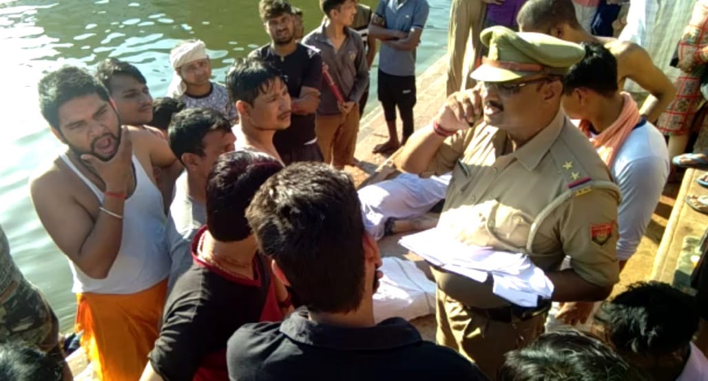 – गोवर्धन परिक्रमा मार्ग के राधाकुंड में स्नान के दौरान दो युवकों की मौत के बाद जानकारी करती पुलिस