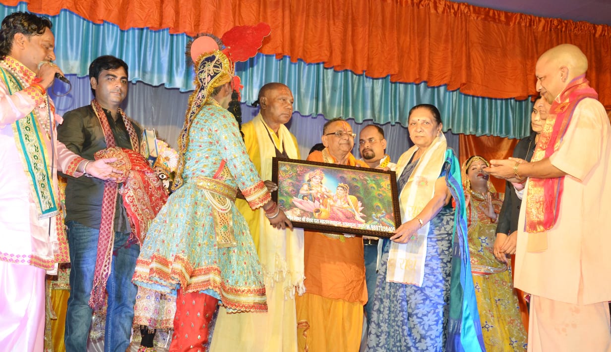 लखनऊ में श्रीकृष्ण जन्म महोत्सव में राज्यपाल आनंदीबेन पटेल व मुख्यमंत्री आदित्य नाथ योगी को बधाई देकर सम्मानित करते गद्दीनशीन महंत संत केशव दास महाराज, मुरारी लाल तिवारी, पत्रकार कृष्ण चंद दुबे व अन्य