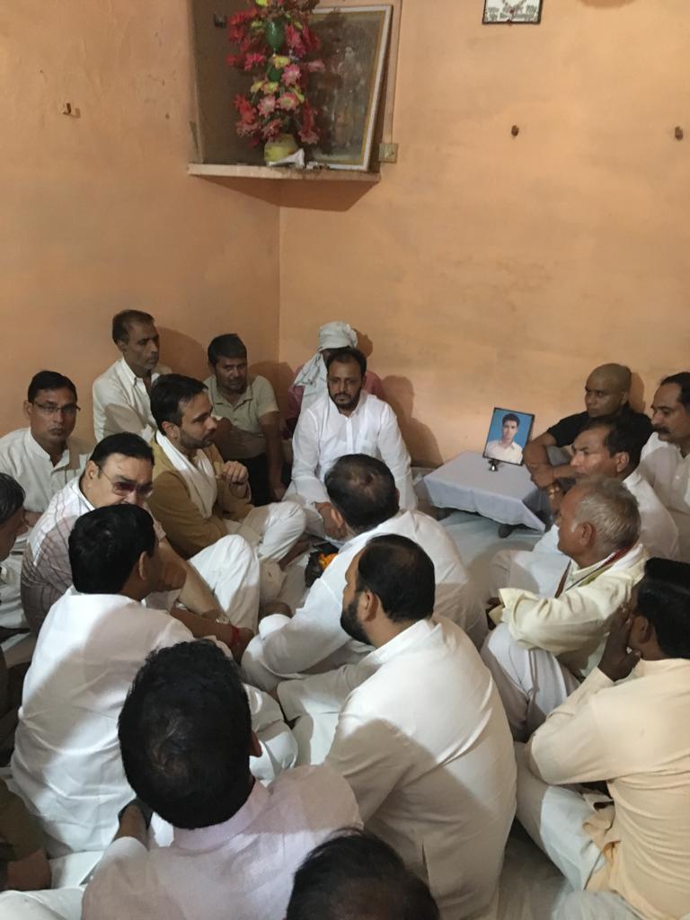 फरह | बीते दिन राइफल की गोली से शहीद हुए महुअन के आईटीबीपी जवान भीमसेन को श्रद्धांजलि देने रालोद मुखिया व किसान मजदूर नेता जयंत चौधरी उनके आवास पर पहुंचे | संकट की घड़ी में पीड़ित परिवार को उन्होने ढाढस बंधाया | इस मौके पर श्री चौधरी ने कहा कि रालोद मुश्किल घड़ी में उनके साथ खड़ा है | इस मौके पर उनके साथ पूर्व अध्यक्ष जिला पंचायत अनूप चौधरी, रालोद जिलाध्यक्ष रामरसपाल पौनियाँ, गुड्डू चौधरी, ब्रज क्षेत्र अध्यक्ष, बॉबी चौधरी, योगेश पूर्व प्रधान महुवन, साहब सिंह तोमर पूर्व प्रधान, बच्चन पहलवान, कुंवर नरेंद्र सिंह, चेतन मलिक, जेपी चौधरी, विकास गोधर, अनुज चौधरी, नीरज चौधरी, चाचा हर्ष चौधरी आदि नेता मौजूद रहे |