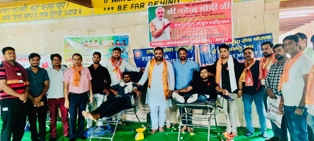 गोवर्धन। प्रधानमंत्री नरेंद्र मोदी के जन्मदिन पर भाजपा युवा मोर्चा मथुरा महानगर द्वारा श्रीजी बाबा इंटर कालेज जतीपुरा में रक्तदाता फाउंडेशन एवं संघ कार्यकर्ता स्व रामनाथ शर्मा की स्मृति में परिवारजनों के सहयोग से रक्तदान शिविर का आयोजन किया। शनिवार को आयोजित शिविर का शुभारंभ एवं जिलाध्यक्ष यज्ञदत्त कौशिक एवं प्रधानाचार्य सतेन्द्र सिंह ने बिहारी जी के चित्रपट पर पुष्प अर्पित कर किया और रक्तवीरों का हौसला बढ़ाया। मुख्य संयोजक यतेंद्र फौजदार ने बताया कि शिविर में 398 यूनिट रक्त एकत्र हुआ है। जो गंभीर बीमारियों के मरीज़ों के काम आएगा। भाजपा मंडल अध्यक्ष श्याम सुंदर उपाध्याय एवं राकेश तिवारी ने रक्तदान से होने वाले फ़ायदे के बारे में सभी को अवगत कराया और आगे भी सभी से समय-समय पर रक्तदान करने की अपील की। विथलेश पाराशर एवं केशव मुखिया ने सभी रक्तदानियों को स्मृति चिन्ह देकर सम्मानित किया। कार्यक्रम में मुख्य रूप से दीपक मिश्रा, देव सूर्यवंशी, हेमराज कुंतल, गौरव कौशिक, गौरव चौधरी, अंकुर शर्मा, आयुष लाला, डा जीएस राणा, हरी शर्मा, पीयूष शर्मा,अवदेश शर्मा आदि उपस्थित रहे।।रक्तदान करने वालों में भारत सिंह, विवेक अग्रवाल, गोपाल, अतुल पराशर, सावित्री जी, मान सिंह, योगेश, लोकेश, रामेश्वर आदि शामिल रहे। सद्भावना ब्लड बैंक द्वारा रक्त संग्रहित किया गया। सभी रक्तवीर और अथितियों का धन्यवाद भानू पाराशर ने दिया।