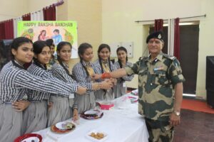 मथुरा। सीमा सुरक्षा बल की 167 वीं बटालियन मुख्यालय में रक्षाबंधन पर्व बड़े ही उत्साहपूर्वक मनाया गया। फौजीयों की कलाईयों पर राखी बाँधने के लिए स्कूली छात्राएं बीएसएफ कैंप पहुंची और जवानों की कलाईयों पर छात्राओं ने राखियाँ बाँधीं। स्कूली छात्राओं ने कहा कि हमारे फौजी भाई घर-परिवार से बाहर देश की रक्षा में समर्पित रहते हैं और त्योहारों पर घर नहीं पहुंच पाते हैं, इसलिए हम सभी छात्राओं ने अपने फौजी भाईयों को कलाई पर राखी बाँधी हैं, ताकि उन्हें अपनी बहनों की कमी महसूस न हो। देश के हर क्षेत्र में फौजी भाईयों के लिए उनकी बहनें राखियाँ बाँध रही हैं। बीएसएफ मुख्यालय बाद में जवानों की कलाईयों पर राखी बांधने वाली छात्राओं में प्राथमिक विद्यालय बाद एवं कान्हा माखन पब्लिक स्कूल की छात्राएं उपस्थित रही। इस मौके बिनोट सिंह द्वितीय कमान अधिकारी, हिमान्शु गौरव डिप्टी कमाण्डेंट, चन्द्रपाल सिंह डिप्टी कमाण्डेंट, एस.के. शुक्ला डिप्टी कमाण्डेंट, अजय कुमार शर्मा डिप्टी कमाण्डेंट,प्रधानाध्यापिका नीरज मथुरिया व दिनेश सिंह तरकर मौजूद थे।
