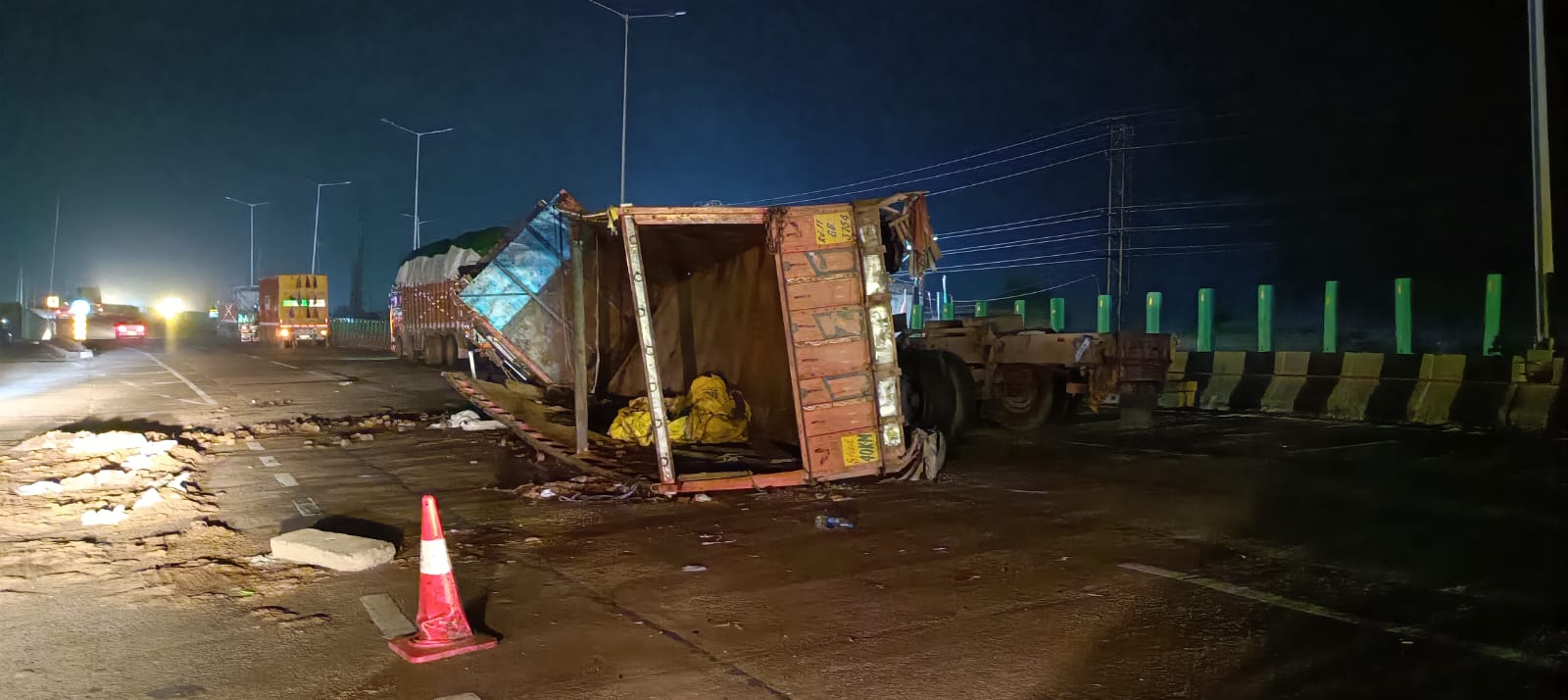 ट्रक में गोबर का ऑर्गेनिक खाद के कटे थे जो हाईवे पर बिखर गए।सूचना पर पहुंचे बाद चौकी प्रभारी लोकेंद्र सिंह ने क्रेन मशीन बुलाकर रास्ता खुलवाया,जिससे आवागमन सुचारू हो सका। एनएचएआई का कोई अधिकारी मौके पर मौजूद नहीं था।