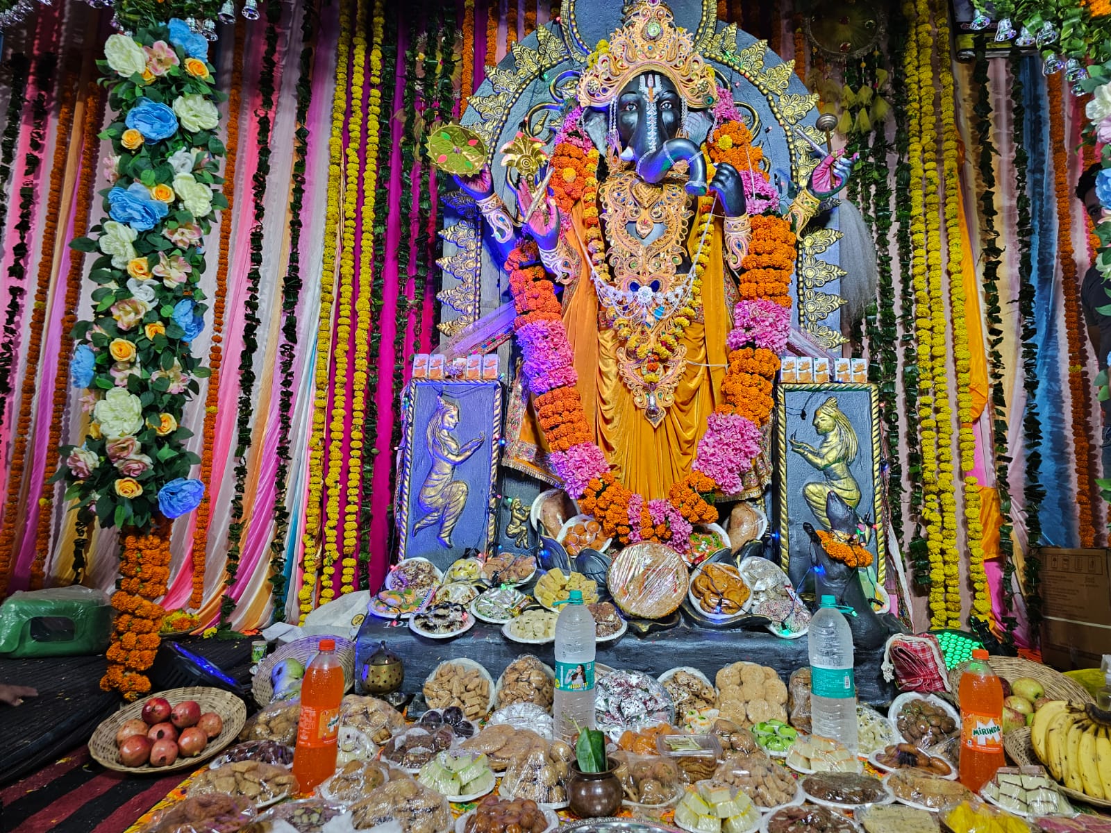 गणेश महोत्सव समिति ने 15 वें गणपति पंडाल में पहली बार श्याम वर्ण में भगवान गजानन को विराजमान किया था। शाम को यहां छप्पन भोग सजाए गए, पंडाल को फूलों से सजाया गया। दर्शन के लिए शाम से ही श्रद्धालुओं की लाइन लगने लगी। रात को आरती के बाद प्रसाद वितरण किया गया।