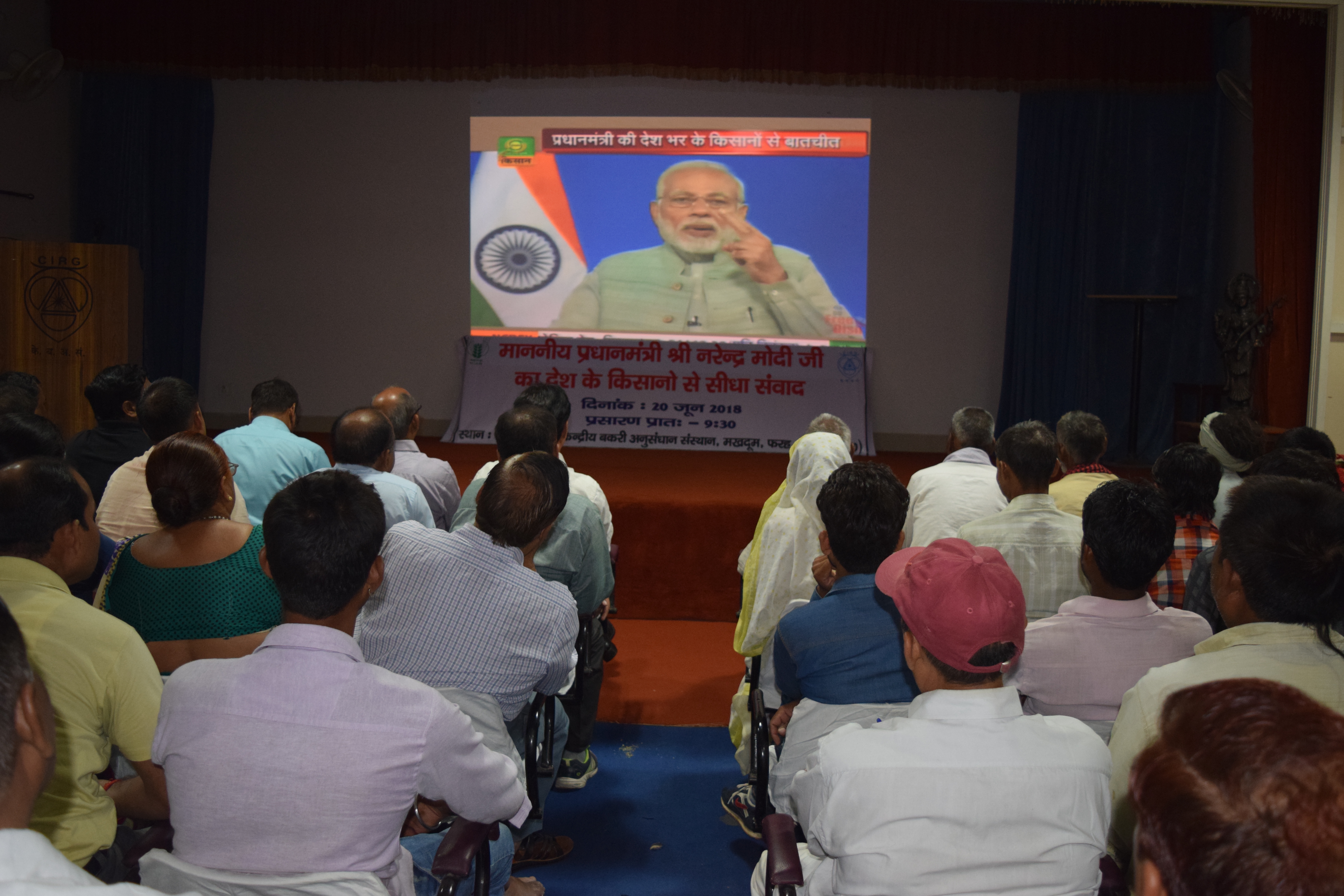 मकदूम (फरह) मथुरा 20 जून। केन्द्रीय बकरी अनुसन्धान संस्थान के केन्द्रीय सभागार में प्रधानमंत्री श्री नरेन्द्र मोदी जी का किसानों ने सीधे संवाद कार्यक्रम के तहत फरह एवं आस-पास के किसानों के देखने की व्यवस्था की गई। इसके साथ ही संस्थान के सभी विभागाध्यक्ष, वैज्ञानिक, तकनीकी अधिकारी और लेखाधिकारी सभी प्रशासनिक अधिकारी एवं कर्मचारीगण, सहायक शोध छात्र भी इसमें शामिल हुए।