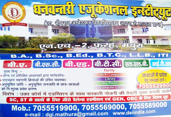 फरह। कस्बा स्थित धन्वतरी एजुकेशनल इंस्टीटयूट उच्च शिक्षा के क्षेत्र में अग्रणी स्थान बना रहा है। कालेज का हर बर्ष स्नातक परीक्षाओं का श्रेष्ठ परिणाम योग्य फेकल्टी के समर्पण को दर्शा रहा है। कालेज सचिव प्रियंक सारस्वत बताते हैं कि कालेज में स्टूडेंटस को भौतिक सुखद वातावरण और अच्छा लान ही नहीं वरन कुशल व समर्पित फैकल्टी भी प्रदान की जाती है। उन्होने बताया कि एससी एसटी छात्रों को निशुल्क पूरे साल पढाई कराई जाती है। उन्होने बताया कि कालेज में प्रवेश शुरू कर दिए गए हैं। छात्रों को सरकारी नौकरियों की तैयारी के लिए अलग से निशुल्क कोचिंग भी वे कराते हैं।