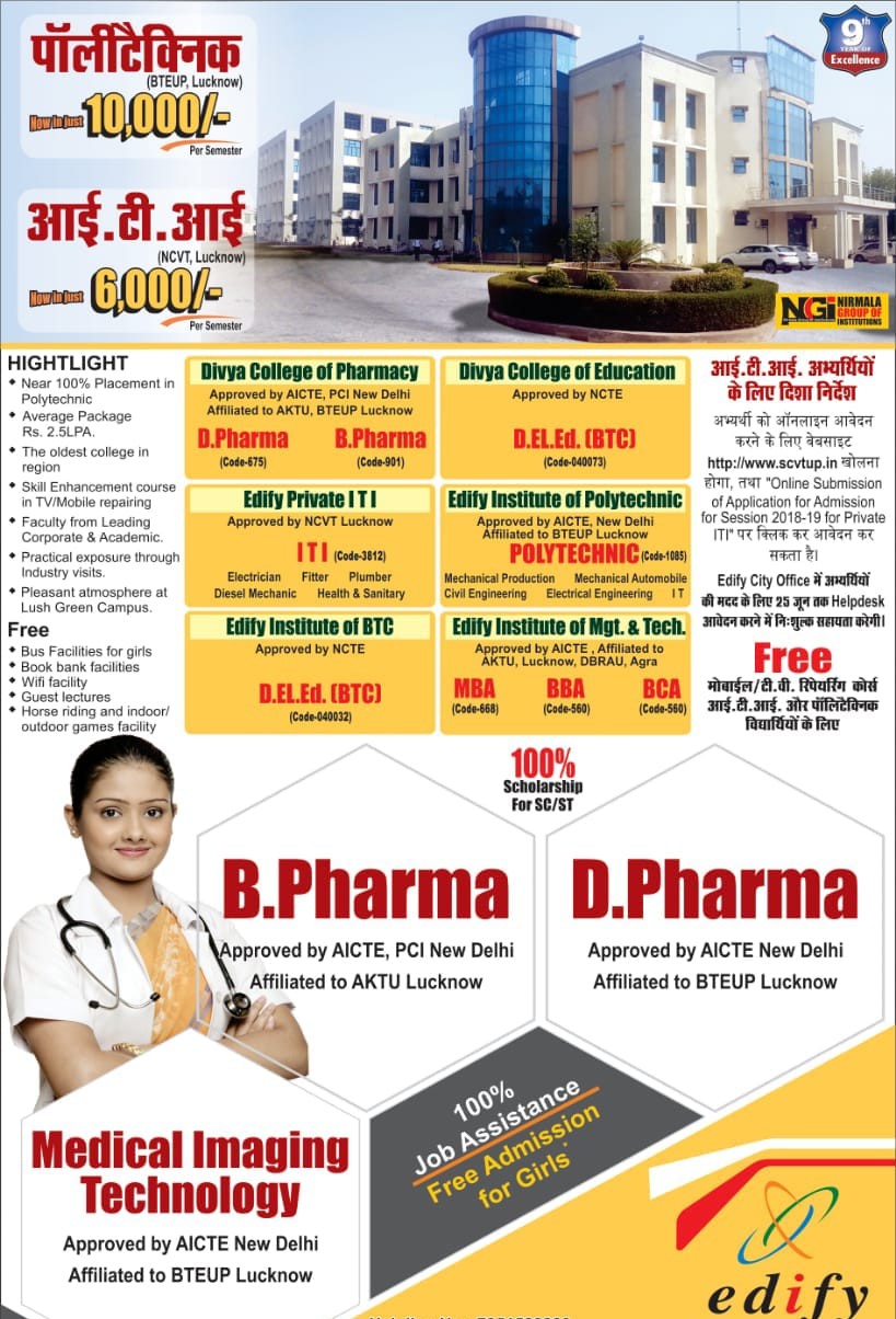 ग्रुप के चेयरमेन हर्ष भास्कर ने बताया कि एनजीआई के तहत संचालित दिव्या कालेज आफ फार्मेसी जिसमें बी और डी फार्मा कोर्सेज इसी बर्ष शुरू हुए हैं। इनमें स्टूडेंटस को प्रवेश दिया जा रहा है। दिव्या कालेज आफ एजुकेशन में डीएलएडद्विवर्षीय पाठयक्रम संचालित हैं। इसी ग्रुप के कालेज एडीफाई में आई टीआई, पालीटेक्निक और मैनेजमेंट कोर्सेज एमबीए, बीबीए और बीसीए कराए जा रहे हैं। उन्होने कहा कि कालेज का परिणाम हर वर्ष श्रेष्ठ रहता है। कुशल और योग्य फैकल्टी के निर्देशन में छात्रों को प्रशिक्षण प्रापत हो रहा है। उनहोने कहा कि संस्थान कोर्सेज के साथ साथ इस बार प्लेसमेंट पर भी जो दे रहा है।