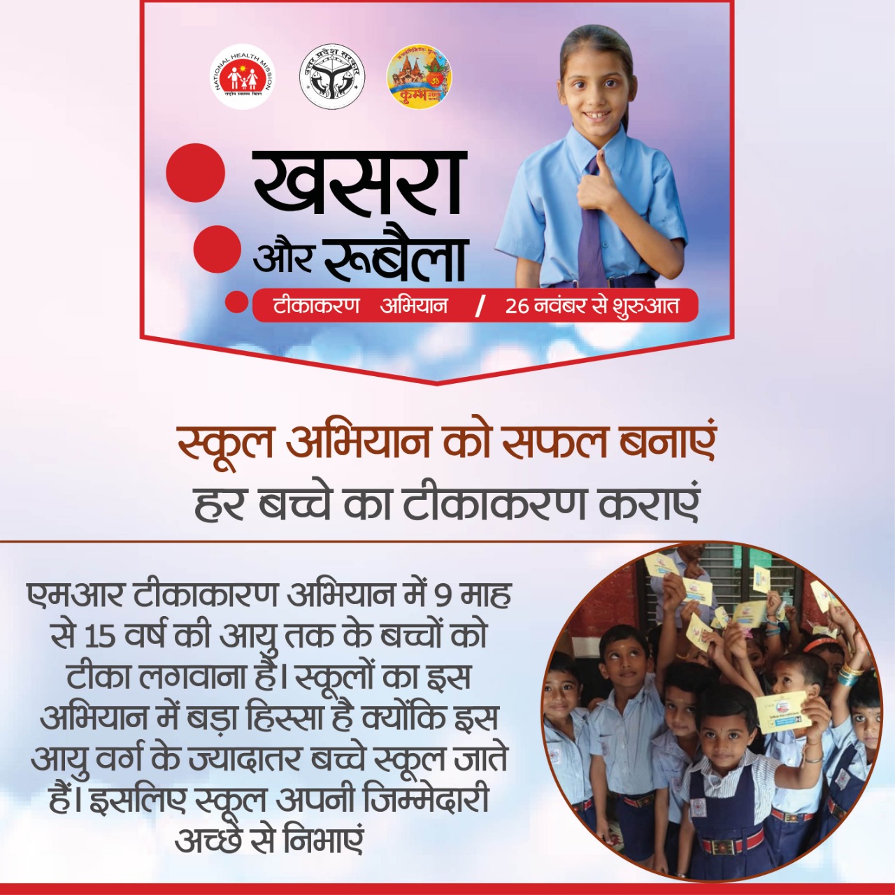 एमआर यानी मीजल्स और रूबेला टीकाकरण अभियान के तहत स्ववित्त पोषित प्राथमिक व उच्च प्राथमिक एवं इंटर कॉलेज के प्रधानाध्यापक एवं प्रधानाचार्य का एक दिवसीय कार्यक्रम डीएम के आदेश पर ब्लॉक सभागार में 11 से 2 बजे तक रखा गया है। सामुदायिक स्वास्थ्य केंद्र के अधीक्षक डॉ रामवीर सिंह ने संबंधित स्कूलों के हेड मास्टर व प्रिंसिपलो को प्रशिक्षण में अनिवार्य रूप से भाग लेने को कहा।डॉ सिंह के अनुसार प्रशिक्षण में 9 से 15 वर्ष के बच्चों को खसरा व रूबेला के टीके लगाने का निशुल्क प्रशिक्षण दिया जाएगा।