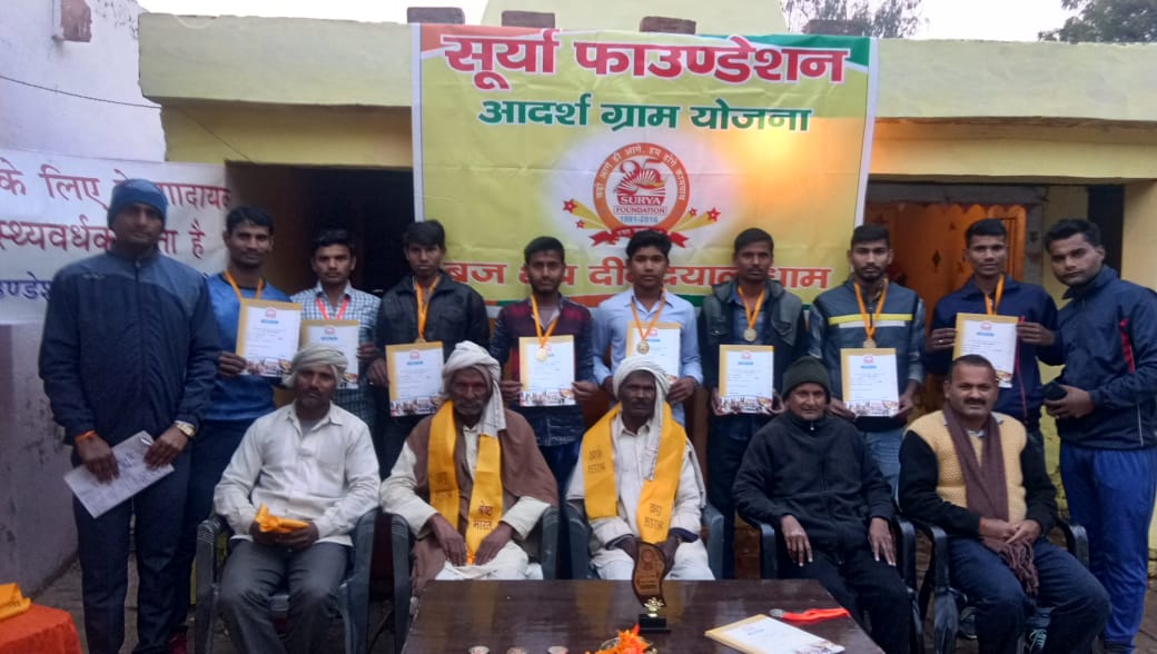 फरह।सूर्या फाउंडेशन द्वारा चल रहे सात दिवसीय खेलकूद प्रतियोगिता का पुरस्कार वितरण कार्यक्रम नगला वर स्थित मंदिर में हुआ।जिसमें बॉलीबॉल,कबड्डी,दौड़ व सुर्य नमस्कार आदि प्रतियोगिताओं के विजेता खिलाड़ियों को सम्मानित किया गया,