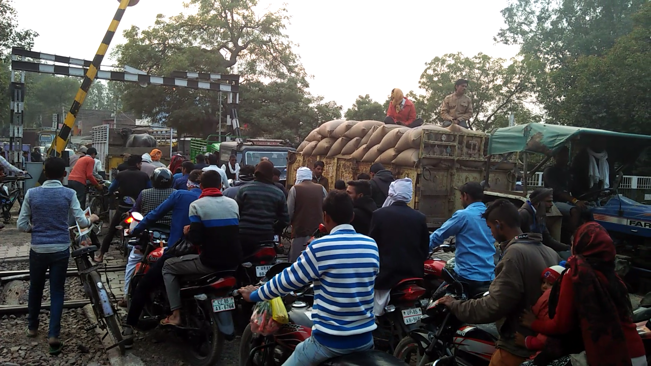 फोटो- रेलवे ट्रैक पर गड्डो में फसा ट्रैक्टर व जाम में फंसी पुलिस की जीप।