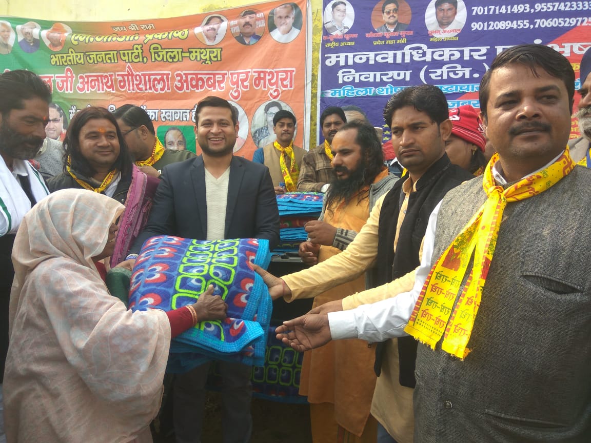 मथुरा/चौमुहाँ, (परीक्षित कौशिक):- ब्लॉक के गाँव अकबरपुर की गोपाल जी अनाथ गौशाला के महंत एवं भ्रष्टाचार निवारण संस्था के जिलाध्यक्ष मदन मोहनदास ने गौशाला पर निराश्रितों को कम्बल एवं वस्त्र वितरित किए। इस मौके पर अतिथि के रूप में उपजिलाधिकारी मौजूद रहे। मदन मोहनदास ने बताया कि आज गौशाला पर गाँव के 200 से अधिक निराश्रित लोगों को कम्बल एवं उपयोगी वस्त्र वितरित किए हैं।