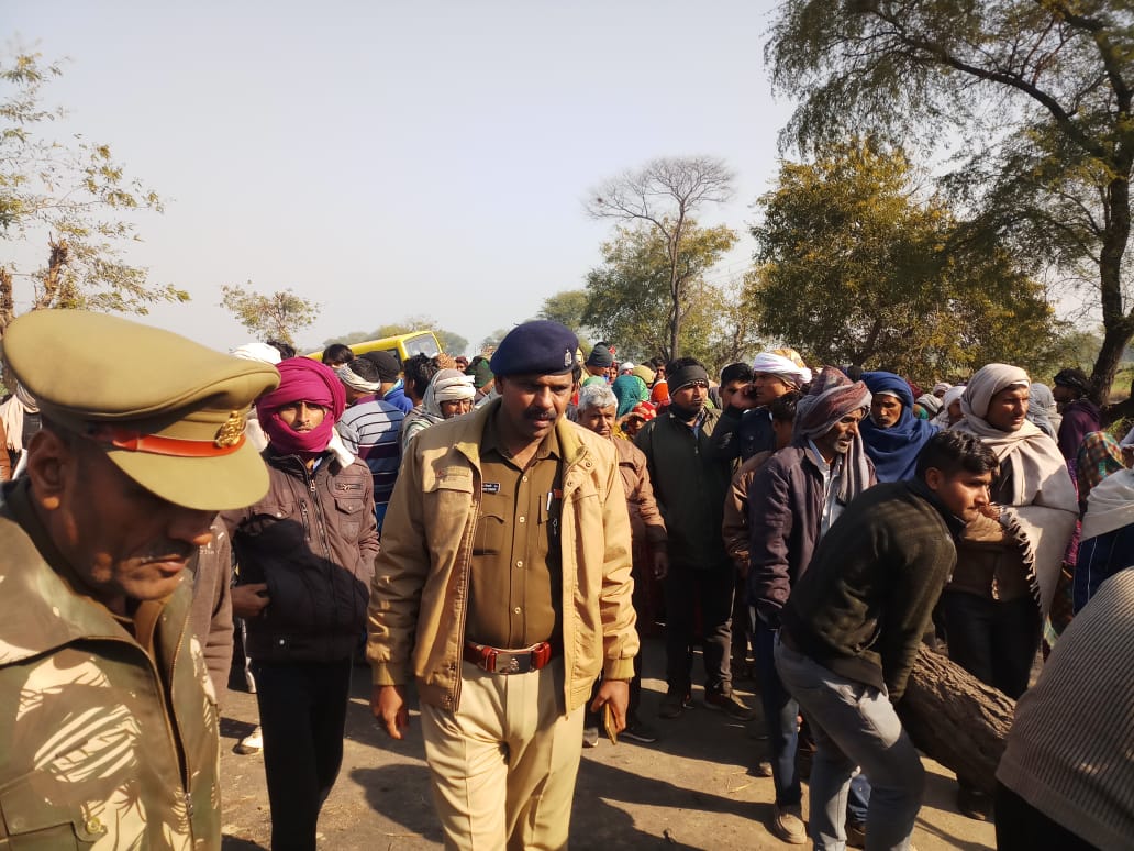 हादसा होते ही ग्रमीण मौके पर जुटने लगे। बताया गया है कि राजवीर की सौर गांव में भी रिश्तेदारी होने से यहां के काफी लोग पहुँच गए। और रोड पर कटे हुए पेड़ व आड़े तिरछे वाहन खड़े कर सड़क के बीच मे शव रख कर जाम लगा दिया।