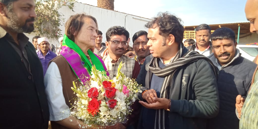 राधाकुंड…बुधवार को श्रीकांत शर्मा ने राधाकुंड की सुरभि गोशाला पहुंचकर पद्मश्री सम्मान मिलने वाली गोभक्त फ्रेडरिक इरिन ब्रूनिंग उर्फ सुदेवी को बुके देकर और दुपट्टा पहनाकर स्वागत किया। बीमार असहाय गोवंश की सेवा करने के लिए सुदेवी को धन्यबाद दिया तथा प्रधान मंत्री और मुख्यमंत्री का आभार भी जताया।