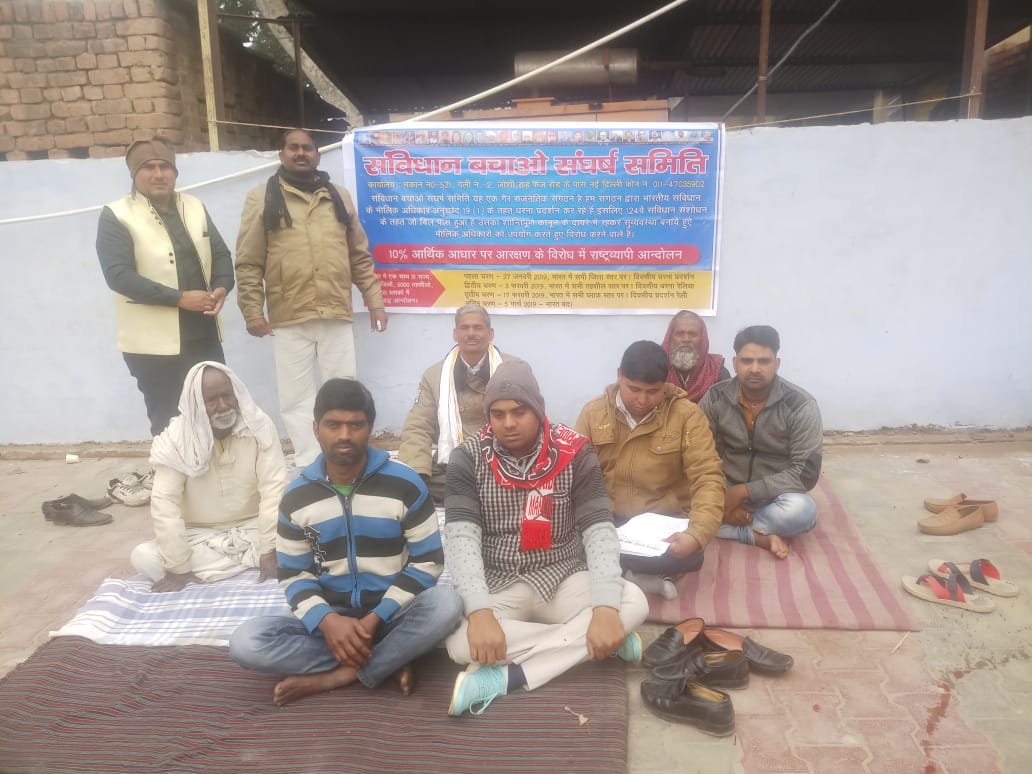 धरना में वक्ताओं ने कहा कि सवर्णों को 10 प्रतिशत आरक्षण दिया जाना संविधान के मौलिक अधिकारों का हनन है। भारत मे जो भेदभाव होता है वह वर्ण जाति और अप्रशयता के आधार पर होता है इस भेदभाव को समाप्त करने की सरकार की कोई योजना नहीं है।वक्ताओं ने कहा कि बिना चर्चा के पारित किए गए इस बिल को तत्काल वापिस लिया जाय।ओबीसी पर लगा क्रीमिलियर हटाया जाए।वहीं एस सी, एस टी अत्याचार निवारण कानून सख्त किया जाए।धरने में क्षेत्रपाल निषाद,इसराइल खान,रिंकू चौधरी,राजू चौधरी,सलीम खान,नईम भाई, विजेंद्र सिंह,नरेश गावर,योगेश कुमार,मुनीम शाह,जगन सिंह आदि मौजूद थे।