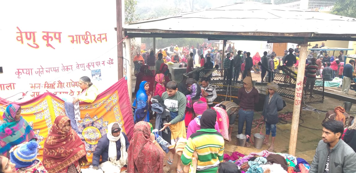 परन्तु बाद में विद्वान पंडितों ने उन्हें बताया कि उन्होंने बछड़े का वध किया है,इसलिए उन्हें इसका पाप लगेगा,इससे मुक्ति पाने के लिए उन्हें सभी तीर्थों की यात्रा करनी होगी। भगवान ने यहीं बांसुरी से कुआं खोदकर सारे तीर्थो का आह्वान किया,सारे तीर्थ वहां आये और अपने पवित्र जल को वेणु कूप में प्रवाहित किया।मान्यता है कि इस कुआं में आज भी सोमवती अमावस्या के दिन ब्रह्म महूर्त में दूध की धार निकलती है। इस कुएं के जल से स्नान करने से सारी मनोकामना पूर्ण होती हैं,वहीं कुआं के स्नान के बाद एक छोटे से कुंड में एकत्रित हुए उस जल में स्नान करने से निसन्तान स्त्री को संतान प्राप्ति होती है। महिलाएं यहाँ स्नान के बाद पुराने बस्त्र आभूषणों का त्याग कर नूतन बस्त्र धारण करती हैं।सोमवार को घने कोहरे के बाद भी बड़ी तादाद में लोग भांडीरवन पहुंचे,महिलाओं ने सन्तान प्राप्ति की उम्मीद लिए कुआं के पावन जल से स्नान किया।भांडीरवन मन्दिर से सेवायत प्रमोद भारद्वाज ने बताया कि राधा जी मांग से सिंदूर भरते हुए अद्वितीय विग्रह केवल भांडीरवन में मौजूद थे। जिसमें कृष्ण भगवान पंजे के बल खड़े होकर राधारानी की मांग भर रहे हैं।