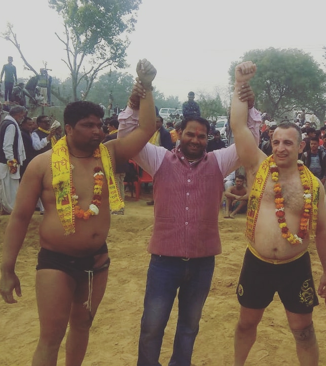 मथुरा:-जिला कुश्ती संघ मथुरा व अखाड़ा शिवशक्ति के तत्वाधान में भानु प्रताप सिंह बीजेपी नेता के सहयोग से 5 फरवरी को मथुरा जिले के कस्बा शेरगढ़ में खिताबी कुश्ती दंगल का आयोजन किया गया ,इस प्रतियोगिता के आयोजक खेलगुरु बृजरत्न अशोकशेखर पहलवान व जिला केसरी सतीश पहलवान जटवारी ने बताया, हमारे बड़े भाई दिल्ली निवासी दीपक अनसुइया के सहयोग से मथुरा की भूमि पर दो विदेशी पहलवानो को उतारा गया जिनका कमेटी द्वारा पगड़ी , माला , पटुका , तस्वीर भेंट कर सम्मान किया साथ ही चीन से आये जेग टोंग की कुश्ती श्यामबीर पहलवान मथुरा से कराई गई जिसमें 10 मिनट तक कड़ा मुकाबला चला| कुश्ती बराबरी पर छुड़ा दी गई | अमेरिका से आये एंटोनियो की कुश्ती मथुरा के कलुआ पहलवान से कराई गई जिसमें कलुआ पहलवान ने अमेरिकी पहलवान को पांच मिनट में चित कर दिया दोनों विदेशी पहलवान बृज में कुश्ती लड़ कर बहुत प्रसन्न हुए और सभी से गले मिलकर भाई चारे का संदेश दिया | सभी देशी व विदेशी पहलवानो का ठाकुर भानु प्रातप सिंह विजेपी नेता ,जिला कुश्ती संघ के अध्य्क्ष हरिओम चतुर्वेदी , ठाकुर यशवीर सिंह राघव , धर्म सिंह , वरिष्ठ पत्रकार विष्णु पहलवान , वीरेंद्र मास्टर , यूपी केसरी सोहनलाल पहलवान , एसओ साहब प्रदीप कुमार , उम्मेद ख़लीपा , भूपेंद्र मिश्रा , रामकिशन कोच साहब , रिंकू पहलवान , रितिक पहलवान , शीशपाल पहलवान आदि ने नगद धनराशि देकर सम्मान किया यह जानकारी अखाड़ा शिवशक्ति के मीडिया प्रभारी लक्ष्य अरोरा ने दी