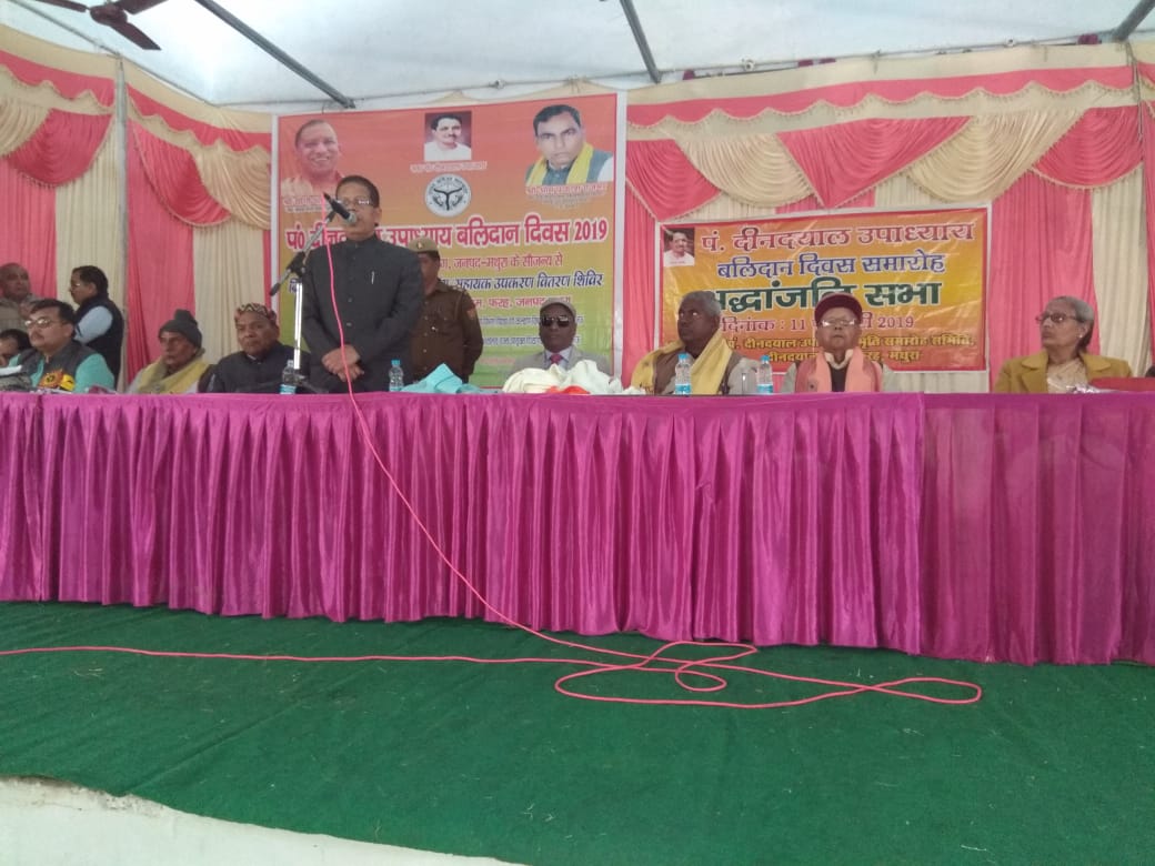 पंo दीनदयाल उपाध्याय बलिदान दिवस पर आयोजित श्रद्धांजलि समारोह में पंo दीनदयाल उपाध्याय जी को श्रद्धांजलि अर्पित करते हुए मुख्य अतिथि डाo अरविंद दीक्षित कुलपति डाo भीमराव आम्बेदकर विश्वविद्यालय आगरा ने कहा कि अब विश्वविद्यालय का सत्र और परीक्षा परिणाम नियत समय से हो रहा है, तो वह पंडित जी के विचारों के कारण से ही संभव हुआ है l हमारी सच्ची श्रद्धांजलि दीनदयाल जी को तभी होगी जब हम उनके उनके बताये दर्शन का अनुसरण करेगे और इस समाज के अंतिम छोर पर खड़े व्यक्ति की भी उन्नति करा कर अपने बराबर खड़ा कर देगें l विशिष्ट अतिथि शैलेंद्र सोनकर उपायुक्त न्यायालय/कार्यालय राज्य आयुक्त दिव्यांगजन उoप्रo लखनऊ ने श्रद्धांजलि अर्पित करते हुए पंडित जी के संस्मरणों को सुनाते हुए उनके जीवन पर प्रकाश डाला l हमारे जीवन में सीखने के लिए पंडित जी के विचार प्रेरित करते हैं l सोनकर ने कहा की दिव्यांगजनों के प्रति सहानुभूति रखें, क्योंकि यह कभी भी किसी को भी कभी भी आ सकती हैं l इसलिए दिव्यांगों के प्रति सकारात्मक सोच रखें l