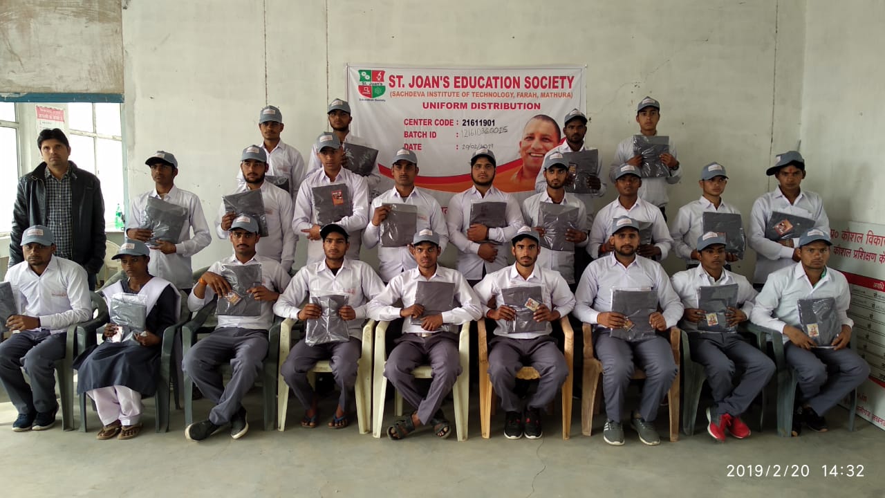 मथुरा। सेंट जोन्स एजुकेशन सोसाइटी अन्तर्गत संचालित सचदेवा इंस्टिट्यूट ऑफ़ टेक्नोलॉजी फरह, मथुरा स्थित केंद्र पर उत्तर प्रदेश कौशल विकास मिशन के 81 छात्र छात्राओं को निशुल्क यूनिफार्म का वितरण किया गया । वितरण समारोह का शुभारम्भ यू पी एस डी एम् के एम् आई एस मैनेजर सुनील यादव ने किया । उन्होने अपने सम्बोधन में छात्रों से कहा कि यू पी एस डी एम् राज्य में सबको हुनर सबको काम के मिशन पर प्रयासरत है । यूनिफार्म पाते ही छात्रछात्राएं खुशी से झूम उठे। इस अवसर पर संस्थान के चेयरमैन डॉ सुधीर सचदेवा ने कौशल के महत्व को समझाते हुए कहा कि प्रत्येक व्यक्ति को हुनरमंद बनाकर ही भारत को समृद्धशाली देश बनाया जा सकता है। संस्थान के कौशल विकास कोऑर्डिनेटर राजेश कुमार ने सभी आगंतुकों को धन्यबाद देते हुए सचदेवा इंस्टिट्यूट ऑफ़ टेक्नोलॉजी के उत्तर प्रदेश कौशल विकास मिशन सेंटर द्वारा किये जा रहे कार्यो से अवगत कराया । इस अवसर पर डॉ ए के सिंह, डॉ भोले सिंह, डॉ पंकज शर्मा, मोहित गहरवार, कैलाश चंद्र देवेंद्र कुमार, गोपाल, दीपक सक्सेना आदि उपस्थित रहे।