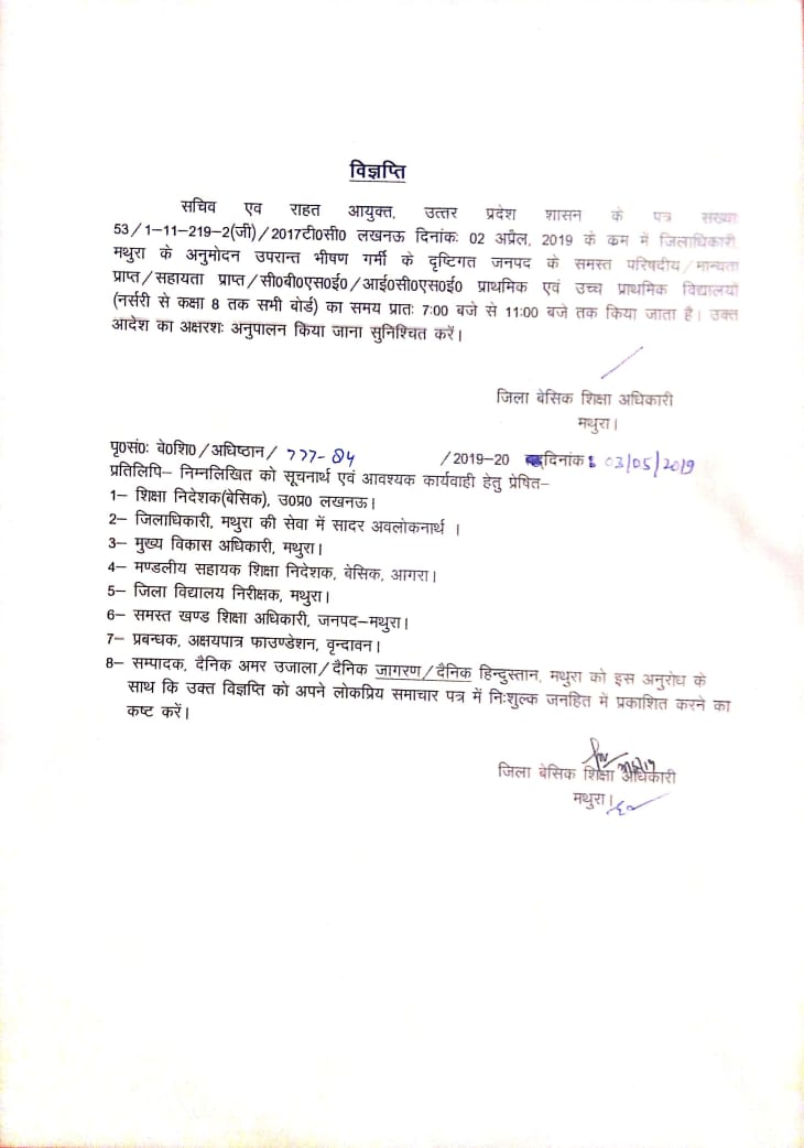 मथुरा | जिला प्रशासन ने तपती दोपहर मे झुलसते छात्रों की सुध ले ली है | एक से आठवीं तक के स्कूलों का समय अब बदल दिया है | इस बावत सूचना अधिकारियों को भी दी गई है | जिला बेसिक शिक्षा अधिकारी ने जनपद के समस्त स्कूलों का समय बदलते हुए आदेश जारी कर दिया है | अब आठवीं तक के सभी स्कूल सुबह 7 बजे से 11 बजे तक ही खुल सकेंगे |